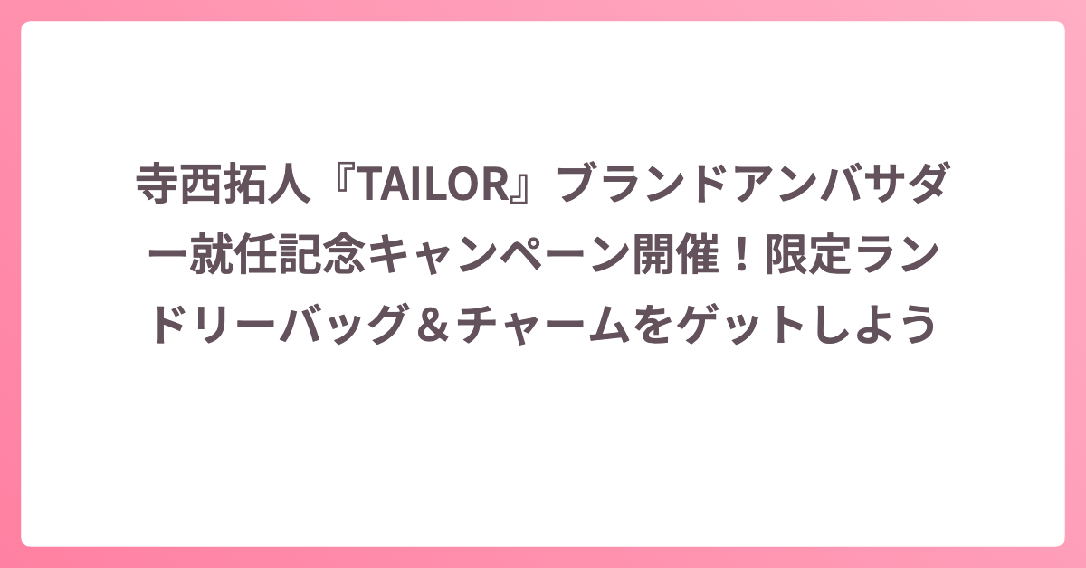 寺西拓人『TAILOR』ブランドアンバサダー就任記念キャンペーン開催!限定ランドリーバッグ&チャームをゲットしよう 2025.09.13 推し活 みお みおノート timelesz原嘉孝、映画初主演『初恋芸人』しまなみ映画祭やゆうばり国際ファンタスティック思い出映画祭にて先行上映決定! 2025.09.11 舞台・映画 みお みおノート "We’re timelesz LIVE TOUR 2025 北海道 真駒内アリーナ遠征レポ|アクセス・物販・会場情報まとめ" 2025.09.08 ライブ みお みおノート FOD配信中の寺西拓人出演作品まとめ【2025年最新】 2025.09.04 推し活 みお みおノート 『TAILOR』柔軟剤 発売レビュー|どこに売ってる? 2025.08.18 推し活 みお みおノート 寺西拓人『TAILOR』柔軟剤ブランドアンバサダーに!会社や商品を調べてみた 2025.08.18 推し活 みお みおノート 自己紹介 2025.08.17 自己紹介 みお みおノート